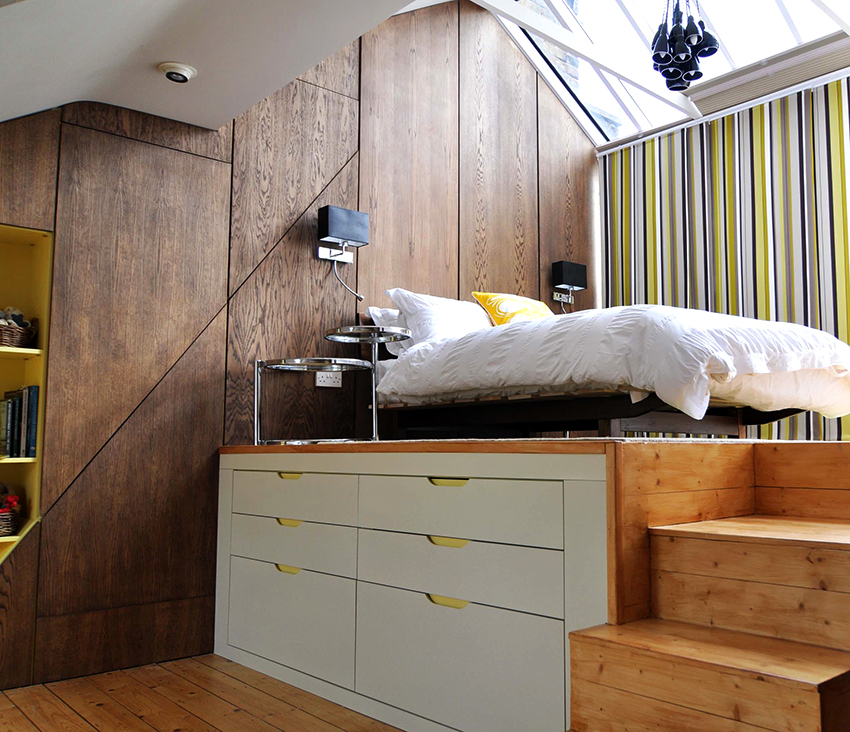 In a room with low ceilings, designers have come up with a similar method: during the day, the bed can be raised to the ceiling, and in the evening it can be lowered down with a special automatic mechanism. In place of the bed, a work area is made out during the day. The disadvantage of this zoning option is the high cost.