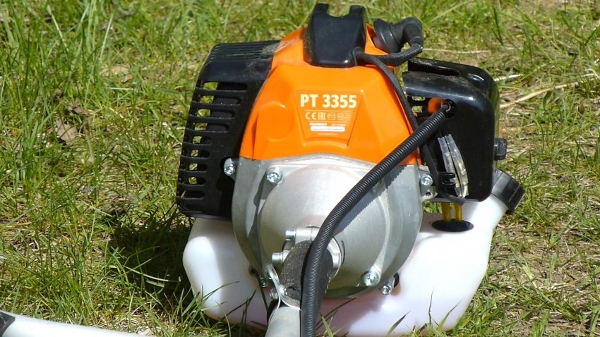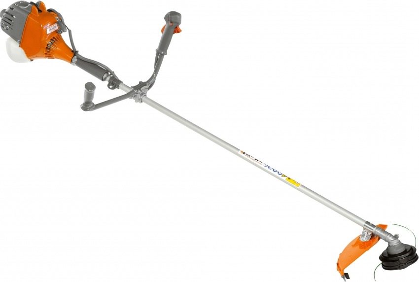 The functionality of the petrol trimmer allows you to successfully use it even on very difficult areas, the processing of which cannot be handled by a lightweight small trimmer for household use. The manufacturer has equipped the structure with several protective systems at once, preventing the possibility of overheating and breakage of the tool used for a long time in work.