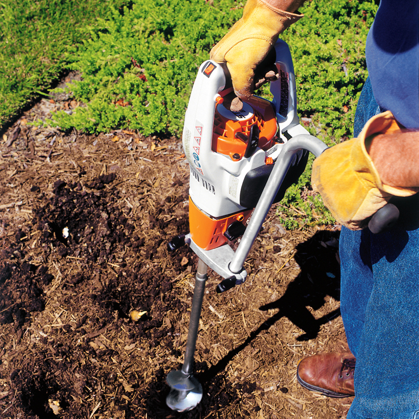 The TISE earth drill is equipped with a supporting base and supplemented with some elements. The soil receiver with auger plates and special cutters ensures quick extraction of soil from the pit. Thanks to the cylindrical storage, a perfectly straight hole can be made in a vertical position. The expandable boom section assists in adjusting the desired depth. If obstacles are found in the ground, the guide pin comes to the rescue.
