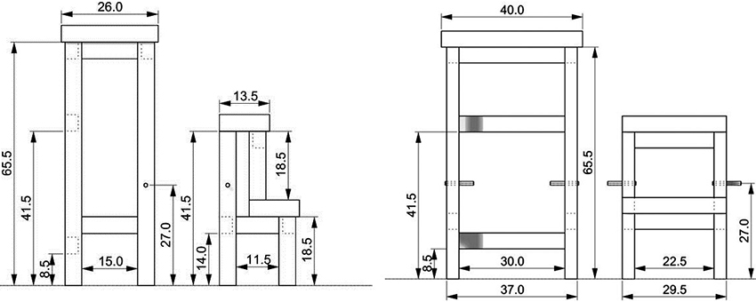 When forming a drawing of a stepladder chair, it should be borne in mind that the degree of height of the product during its operation depends on the length of the supporting legs. In addition, longer legs can be installed, which are placed at an angle to increase the stability of the structure.
