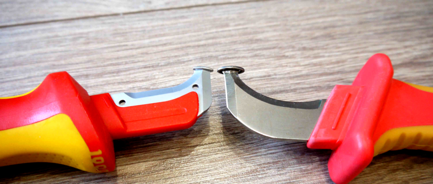 A beak knife with a rounded blade is used to make a circular cut in the insulation. The longitudinal cut must be made very carefully, since this device does not have a cut depth stop. Such a knife is usually used by experienced craftsmen, since certain skills are required to work with a tool with a specific wedge shape.