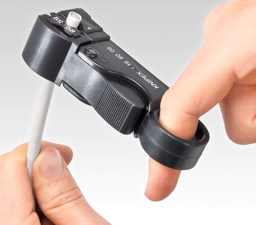 For stripping coaxial cables, Knipex KN-166005SB is a good model. It is capable of removing the outer braid, screen and insulation in one step. The stripper is equipped with three built-in knives, each of which can be adjusted to the depth using a hex wrench. The insulation is removed by rotating the stripper 360 °.