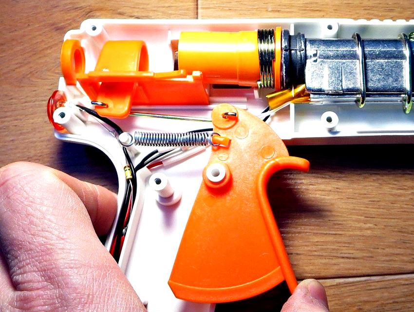 The body of the thermo-gun is made of hard plastic, which makes it possible to reduce heat transfer from the heating chamber and ensure the lightness of the product. The average weight of the tool is approximately 300 g. Quite often the handle is equipped with special anti-slip inserts. It is hollow in the middle, the wires are placed here, the carousel trigger is located. The main components of the tool are located in the barrel.