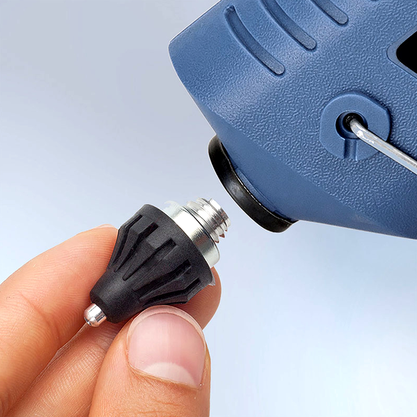 The nipple in the nozzle, used as an additional part, can significantly reduce the amount of glue emitted from the gun in standby mode, and the viewing window helps to monitor the size of the charged rod and control the integrity of the take-up sleeve.