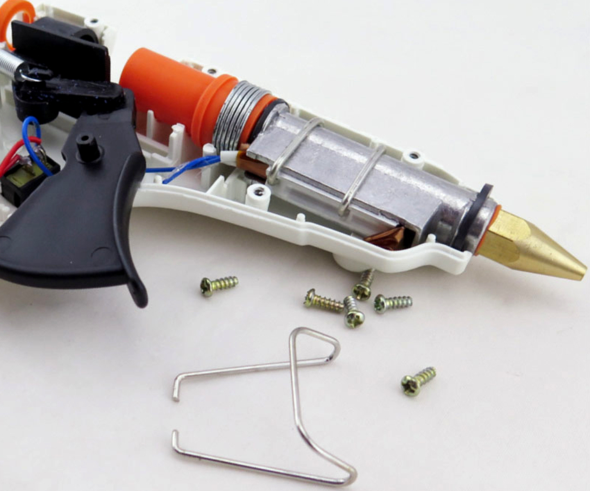Considering the design of a silicone gun, mention should be made of the thrust guide sleeve, which is a tubular receiver located directly in front of the heat chamber. Its function is to seal the "reverse direction", which prevents melt from entering the inside of the gun. This part is the weakest link, since rubber ages and cracks over time, and during overheating it can let the material pass through, stopping the moving parts. This leads to damage to the insulation of the wires, which can eventually cause a short circuit.