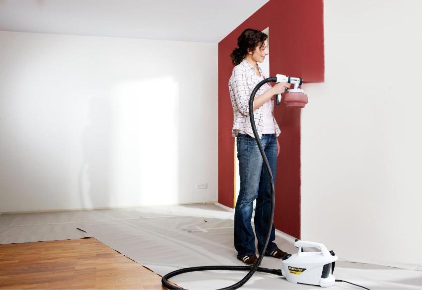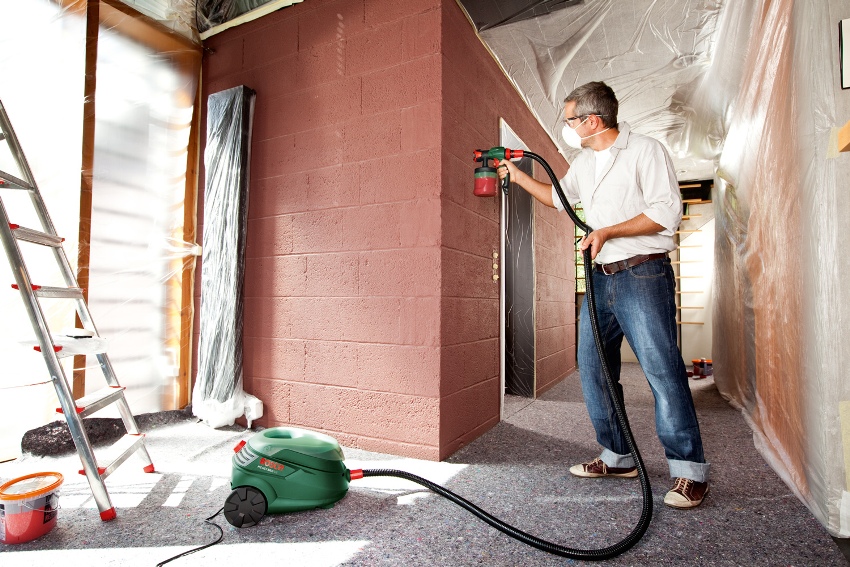 Hand-held models are great for small areas. With the help of such devices, you can paint, for example, a small kitchen or bedroom. For large rooms, experts recommend purchasing pneumatic guns equipped with a compressor. Application of water-based paint to a wall or ceiling is done mechanically. Thus, despite the presence of this device, you still have to work.