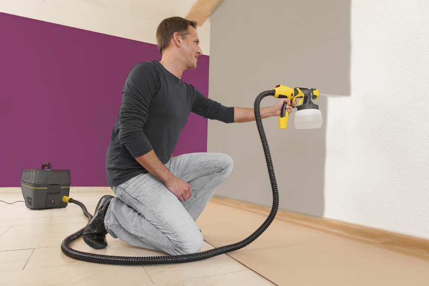 Before starting work, it is recommended to make a test staining. This will allow you to customize your spray gun. If you are painting walls, then you need to remember that you need to adhere to a certain distance to the ceiling and floor, so as not to splash them with the composition. The missing areas are then treated with a brush or roller. Electric home paint spray guns are most effective, but they cost more than manual models. The choice of the device is based on the scope of future work.