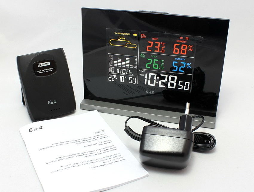 - weather station model EA2 EN209 - the bestseller, equipped with a color display and weather forecast with color animation. In addition to the standard functions of measuring indoor / outdoor temperature, room humidity and atmospheric pressure, the device detects outdoor humidity, warns of the onset of frost and ice, has the ability to connect a special radio sensor for the sauna room. If the outdoor pressure drops or the temperature approaches zero, the device sends a signal to the user about the coming frost in the form of a snowflake symbol. The device displays the history of changes in atmospheric pressure in the form of a graphical histogram. The weather station has additional options in the form of a clock, calendar, date, alarm, short-term and long-term backlighting. There is a setting for the brightness of the backlight. Power is supplied from a home network, or from batteries.
