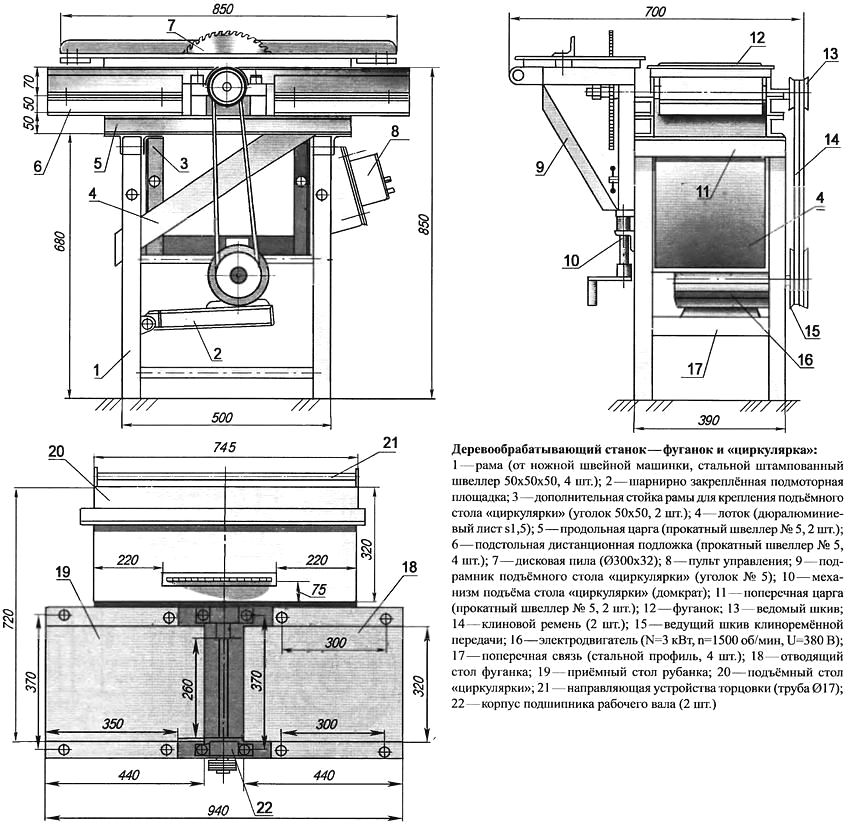 The bench machine is designed for amateur woodworking.In his arsenal there are 2-5 types of processing. Such a unit operates from an electric drive, the power of which ranges from 0.9 to 3 kW. This machine is ideal for a small workshop or a backyard, and its main functions are planing and sawing. You can even find or make drawings of a woodworking machine with your own hands, but without a lack of experience, you should think about buying professional equipment.