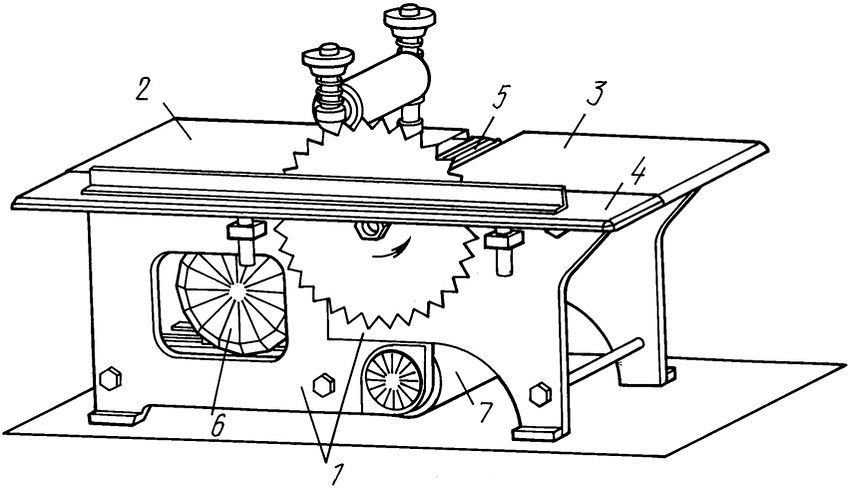 The device of the simplest universal machine with a circular saw and a thickness gauge: 1 - split bed; 2 - receiving movable table; 3 - supporting stationary table; 4 - saw table; 5 - knife drum; 6 - drive; 7 - skin drum
