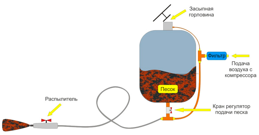 How to make sandblasting with your own hands? There are several ways.For this, 2 main structural schemes are used, the main difference of which is the mechanism for feeding abrasive sand at the output cycle. Despite this, both options require nearly identical parts to create meaningful knots. So, in general, sandblasting consists of the following elements: