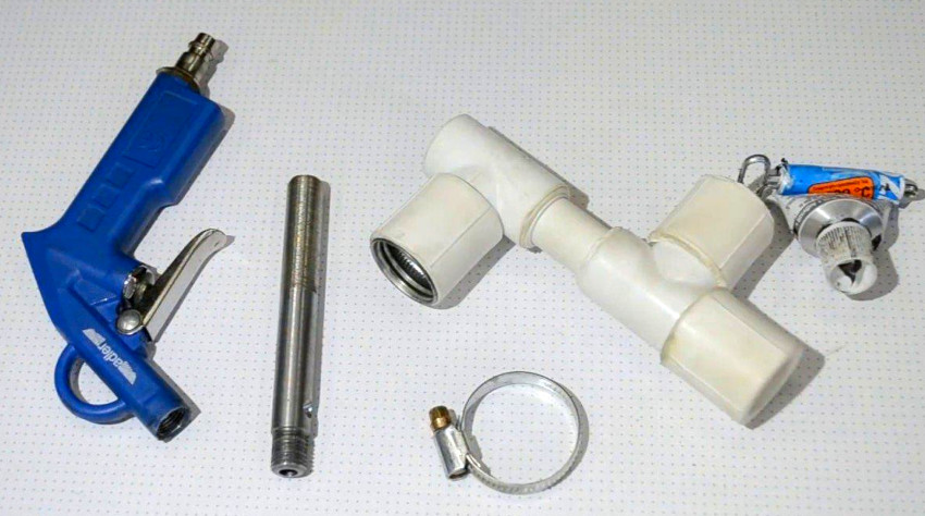 According to the size of the nozzle, a sandblasting gun is produced, to which the fittings and the handle are then connected. The most primitive design is assembled from several fittings for water pipes, a tee, and a plastic sand tank.