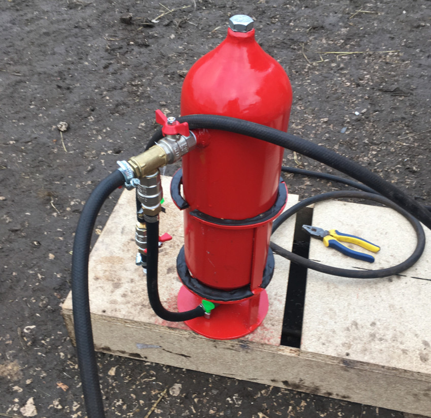 As in the design from a gas cylinder, you will need to make a hole in the bottom of the fire extinguisher to fill in the sand. Then a threaded fitting is attached to the hole made. To give stability to the structure, it is recommended to weld metal legs to the cylinder. This trick will also help secure the bottom hose connection.