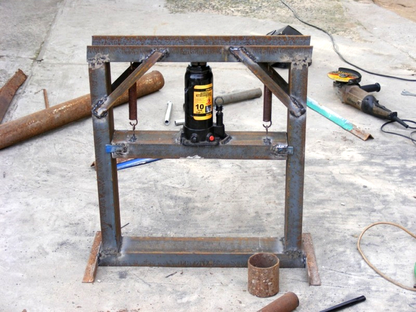 Before you make a press with your own hands, you need to prepare a welding machine, electrodes, grinder, drill and drills. For the finishing of metal structural elements from burrs, you will need a sander. At the first stage, the press frame is assembled. The quality and efficiency of the work process depends on its strength and reliability. The bed will contain the working cylinder (in the form of a jack) and the workpiece to be processed.
