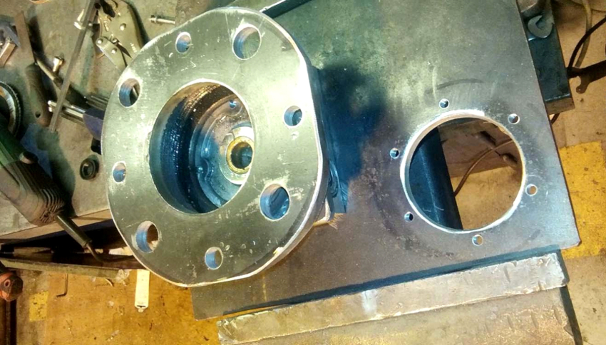 The flange can be made from an automotive hub by turning it on a lathe. In the metal plate for installing the hydraulic cylinder, you need to weld a round boss to fix the lathe in the chuck. After boring the hole, the plate is welded to the base of the frame.