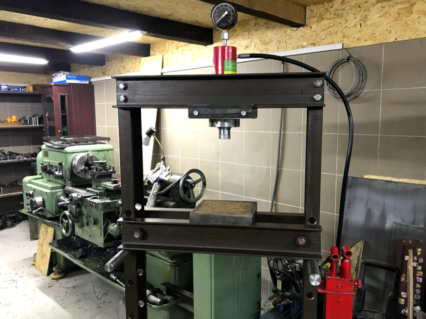 The frame of the structure must withstand significant loads, therefore it must be made of durable material. The best solution is to use a T-beam that will not bend under the hydraulic press.