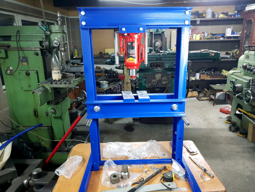 A metal plate with welded beams is fixed to the bed by welding. Holes for fastening bolts are made in it. To ensure the normal operation of the press, an oil station should be installed by connecting it to the hydraulic cylinder using hoses.