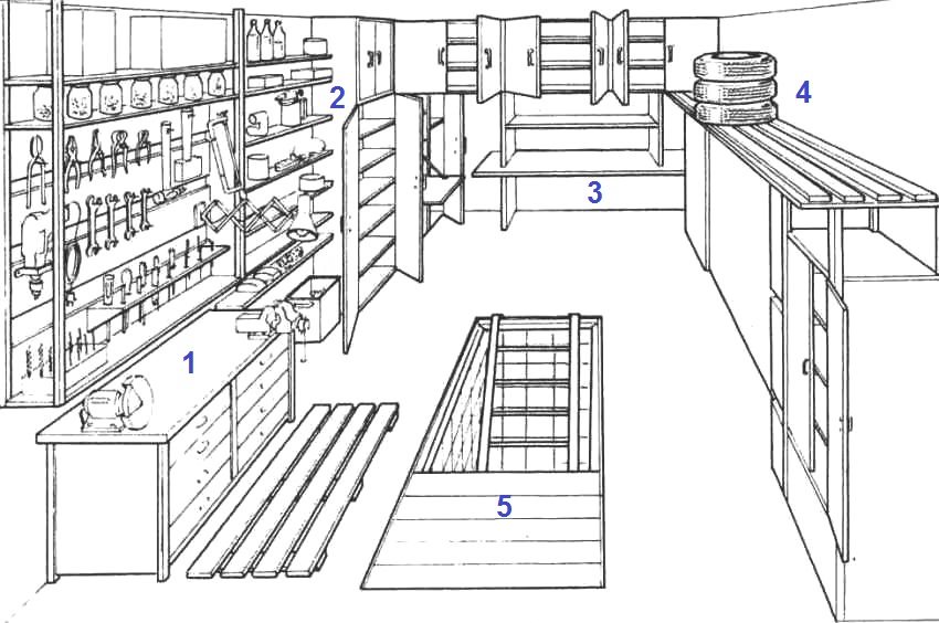An example of placing useful devices in the garage: 1 - crafting table with manual machines, 2 - racks and cabinets, 3 - a table for various repairs, 4 - a shelf for storing tires, 5 - an inspection pit