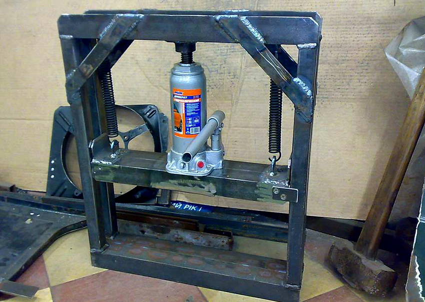 To make a homemade device, you can use the hydraulic press scheme from a jack, which can be found on the Internet. At the first stage, a structure frame is created from a steel profiled pipe, metal corners and a plate. A jack is installed between the thrust plate and the platform, and it is necessary that, when retracted, the rod tip is inside the retainer. The base of the tool is bolted to the movable stop.