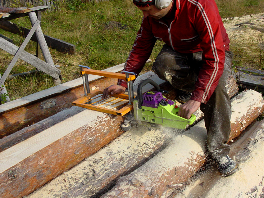 The safety of using the structure is ensured by the fact that you do not need to move the log yourself. For this purpose, a carriage with a saw is used, which, depending on the thickness of the log, is fixed at the required height. Once switched on, the frame moves precisely and the cut remains neat and smooth. You can use the device not only for solid timber, but also for sawing boards, in order to harvest firewood.