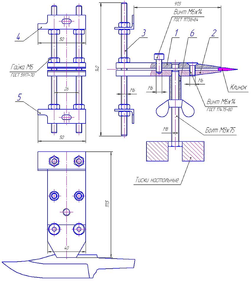 To work, you need a special screw pin. This threaded part is the main active component of the structure. The minimum diameter of the pin is 2 cm, the length of the thread is 15 cm. The longer this part is, the wider the vice can be spread. If you take these dimensional parameters into account in the drawings of the vice with your own hands, you can get a structure that is divorced by almost 8 cm.