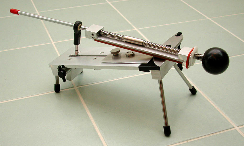 For work, the holder with a sharpening stone is inserted with a cambric into the hole on the guide, and the knife is mounted on a magnet and pressed by a plate, after which you can start sharpening.