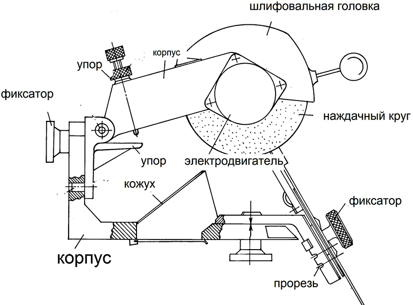 In addition to the table top, a pin is fixed on the base, which serves as a mount for a carriage with a sharpening bar. The guide is made of a small block, on one side of which a hole is drilled for a stud - 8 mm, and on the other side a cut is made and a clamp is installed, allowing the guide to rotate freely on the stud.