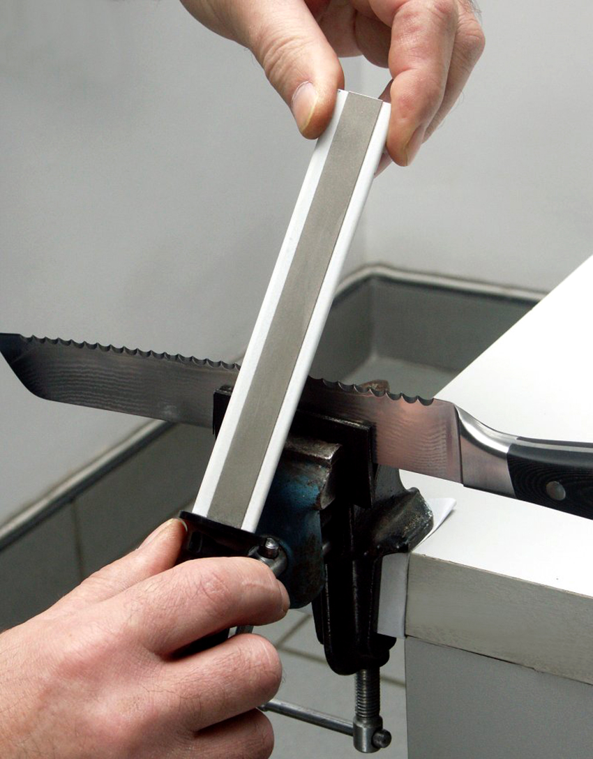 - Sharpening. It is carried out using medium and high-grained abrasive. Improper use of the knife sharpener may result in uneven sharpening of the point.