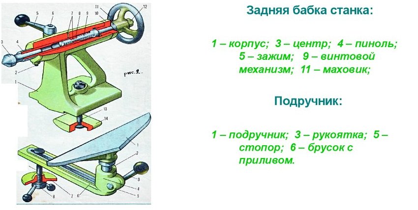 Tailstock. This node, which is part of the woodworking structure, is not static. It performs a very important function: it fixes the blank in the desired position during its processing. Clamping the workpiece by means of the rear assembly takes into account its clamping to the chuck. Due to the fact that the tailstock is able to move freely along the guide elements of the bed, fixation and processing of parts of different lengths is provided.