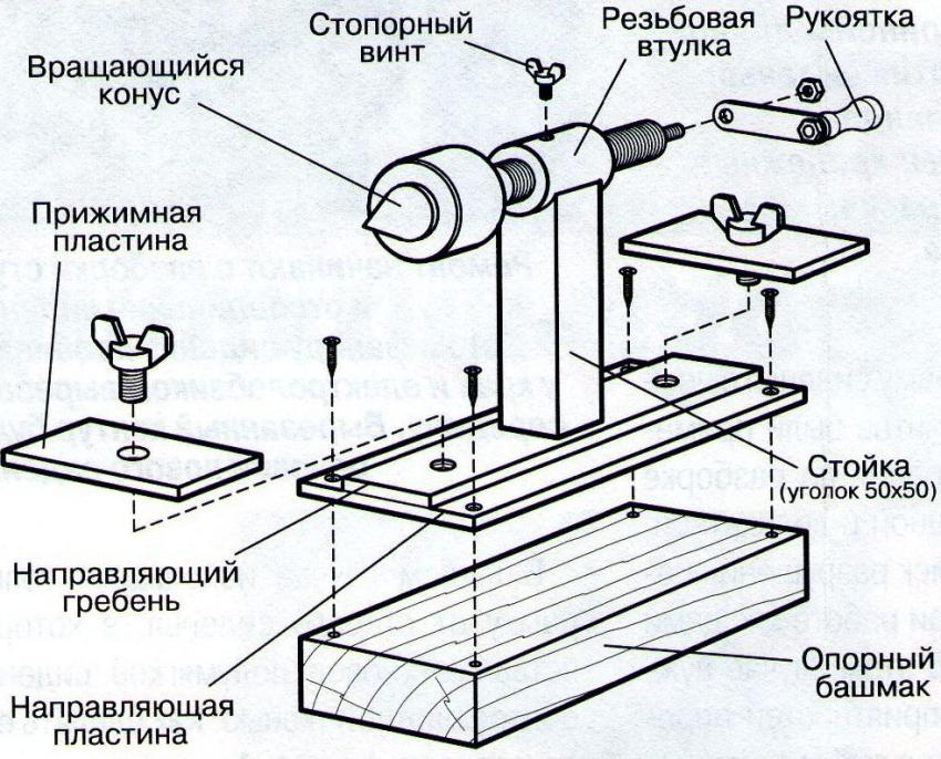 First of all, this concerns the tailstock, which acts as a stop. This assembly is fixed parallel to the drill and, as a rule, is made of wooden blocks. For reliability, it is also recommended to use an adjustment screw, the head of which is sharpened for a cone.