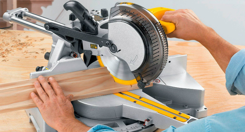 A miter, pendulum saw for wood and metal, or an angle cutter is a stationary cutting-off highly specialized tool that is used to cut materials at a certain angle. This possibility is provided by a turntable and a movable working part with a disc over the bed. The miter saw can cut narrow pieces of wood like slats, bars and planks. It can also be used for sawing hardboard, laminate and OSB. The tool copes well with cutting plastic, aluminum profiles and polyurethane moldings.