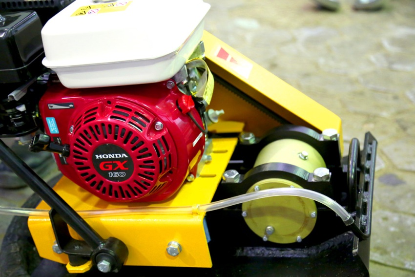 The engine is located above the vibration exciter. The motor and vibrator are connected by a coupling and a V-belt transmission. During operation, the engine creates rotational movements that are transmitted to the vibrator, which converts them into oscillatory ones. These movements are communicated to the plate and then to the surface layer, which is compacted.