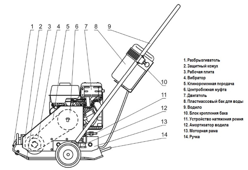 A vibrator is installed on a heavy platform, the basis of which is an unbalanced shaft placed in bearing supports and a cylindrical housing. The structure is fixed with clamps, bolted to the plate. An important part in the device of the vibrating plate, which is also attached to the platform, is the motor frame. It is attached with shock absorbers.