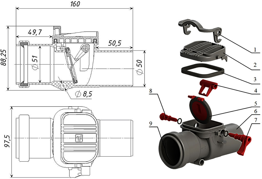 The check valve has more overall dimensions in comparison with the sewer pipe. When installed, it creates narrowed and expanded zones, which are ideal places for blockages. A removable cover located at the top of the device case will help to eliminate such troubles.In this regard, it is not recommended to install a rotary type check valve (40 mm) for sewerage.