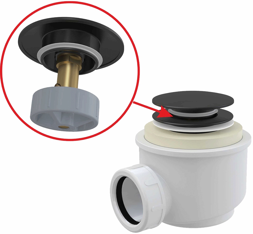 The third option for controlling the drain is the click-clack button, which is included in the complete set of valves. Pressing it once with your foot will completely block the drain hole. Repeated exposure will allow water to flow freely into the sewer system. The siphon in the shower cabin with a click-clack button is the most reliable, convenient to use, easy to install and durable option. In addition, this water outlet system has an attractive design. The disadvantage of this option is the high cost of the product.