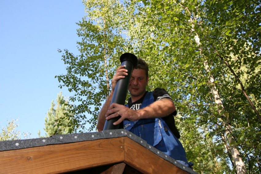 To install the pipe in the catwalk of the toilet, as well as in its roof, slots of the corresponding diameter are made. The pipe must rise at least 0.2 m above the roof.
