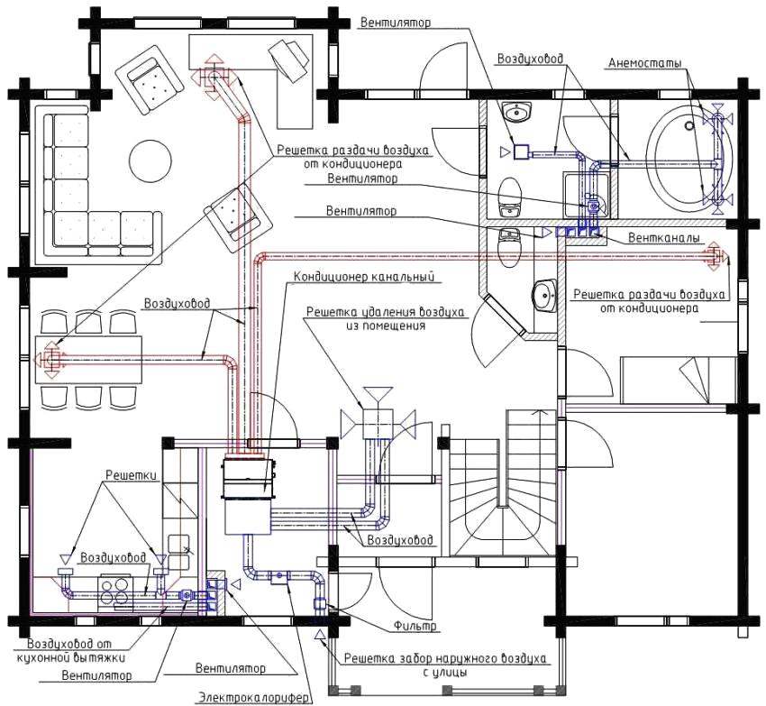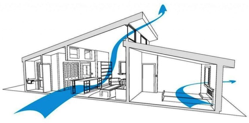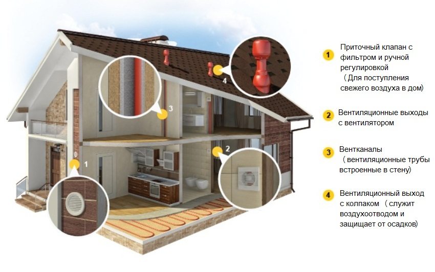 The ventilation scheme in a private house with your own hands should provide not only drainage, but also the flow of air in sufficient quantity. If you do not take care of this, then we can assume that the house does not have proper ventilation. The tightness of windows and doors becomes the reason that natural ventilation ceases to function in the house and the process of air stagnation is observed. In addition, the work of forced air exchange will lead to the opposite effect, when through the channels of natural exhaust air begins to move in the opposite direction along with all dust accumulations.