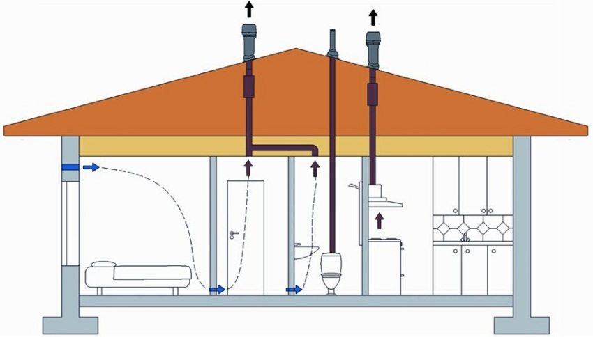 The diagram of natural ventilation in a private house shows the location of vertical air duct pipes that start in the ventilated room and go up to the ridge on the roof.