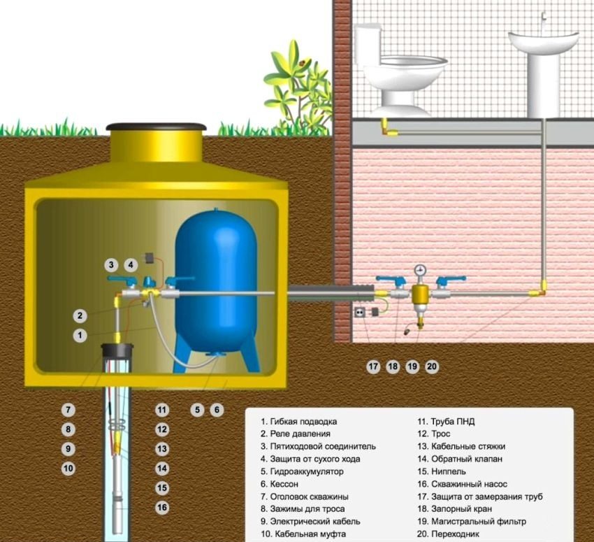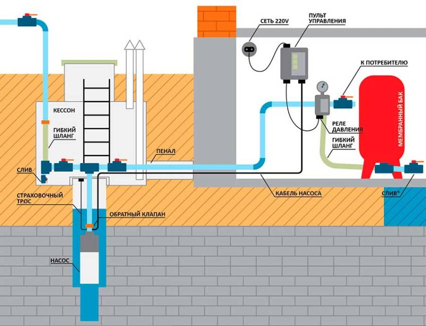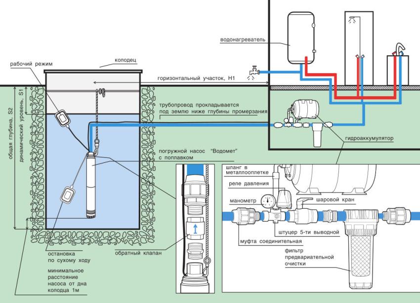 Water supply of a private house from a well using a submersible pump