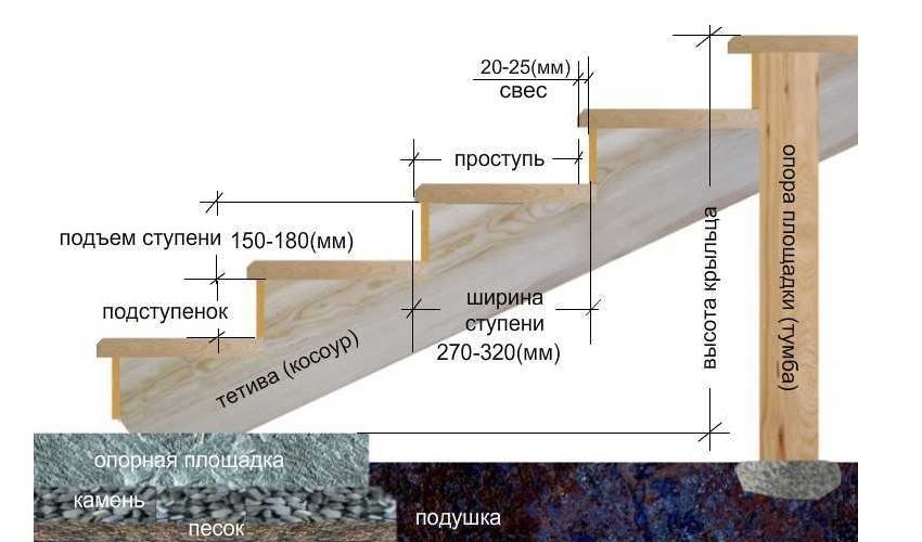 The width of the steps of a hand-made porch made of wood (with or without a canopy) is calculated under the foot of an adult with a margin, that is, 35-45 cm.The height of the riser (the height difference between the steps) should not be more than 20 cm. There must be an odd number of steps. (an additional stiffener is provided), and if there are more than three steps, then you should definitely provide the porch with a railing.