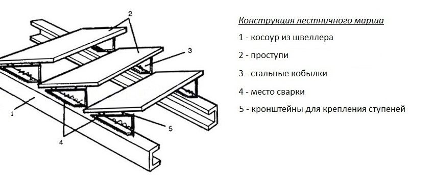 In the same way, a piece is cut from the corner with a length equal to the height between the steps. Both trims are welded to each other in an L-shaped manner (the edge-frame of the step is obtained in the section). Make the right amount, corresponding to the number of steps, of such L-shaped parts and weld them to the channel. Thus, a metal oblique is obtained. In the same way, a second skew-angle is made from another channel.
