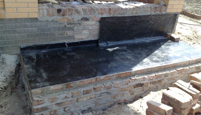 Waterproofing of the porch foundation is required - for its construction, it is enough to cover the bottom of the pit and the inner surface of the formwork with roofing material. For reinforcement, you can get by with several bricks, on which a mesh is laid or a lattice of pieces of reinforcement is attached.