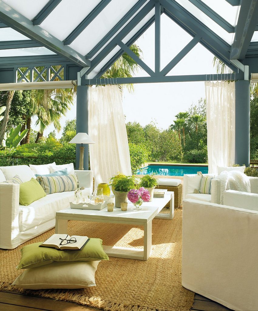 The use of awnings in the courtyard of the house can be very diverse, for example: canopy over the porch, carport, pool or pond, children's play area, shower summer complex, recreation areas, patios, etc. Many people protect the entire territory of the yard with a canopy, covering it completely and using bright colors of transparent polycarbonate. Photos of canopies for summer cottages demonstrate the functionality of such structures for the construction of summer dining rooms and small recreation areas.