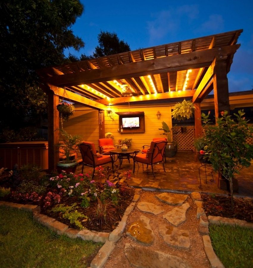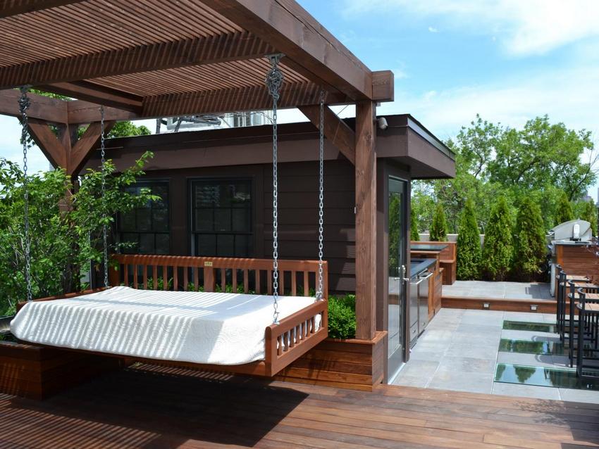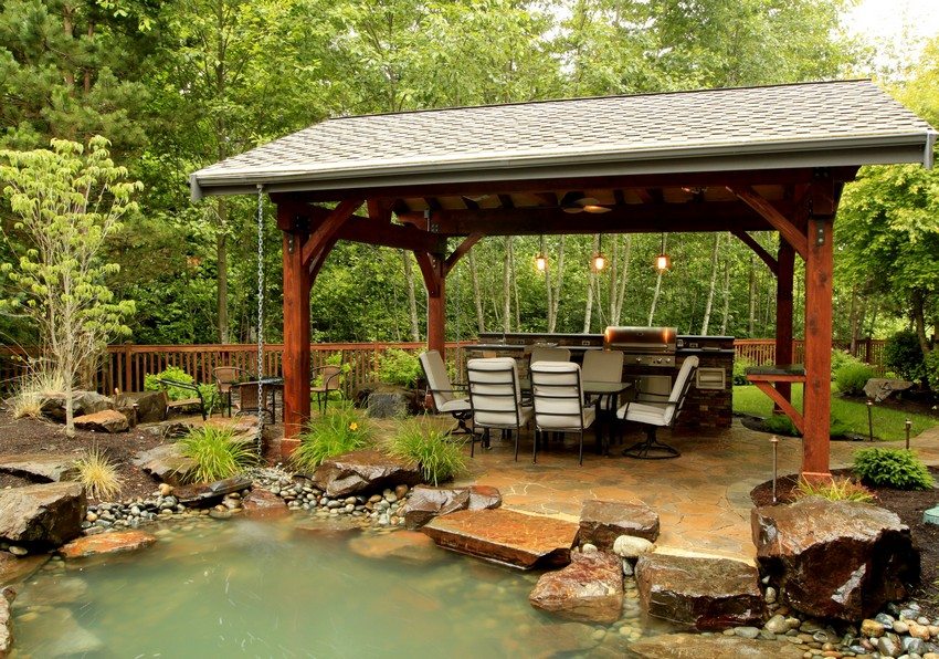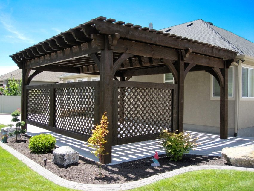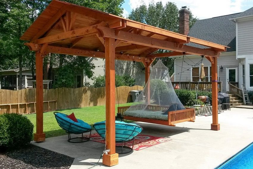 - hip canopy - a more complex structure with a multi-pitched roof in the form of several triangular planes connected to a ridge knot.Depending on the angle of inclination of the roof elements, the structure can be given various shapes: cones, domes, pyramids, etc. Graceful designs of unusual shapes are usually replaced in the garden gazebos, protect recreation areas or swimming pools.
