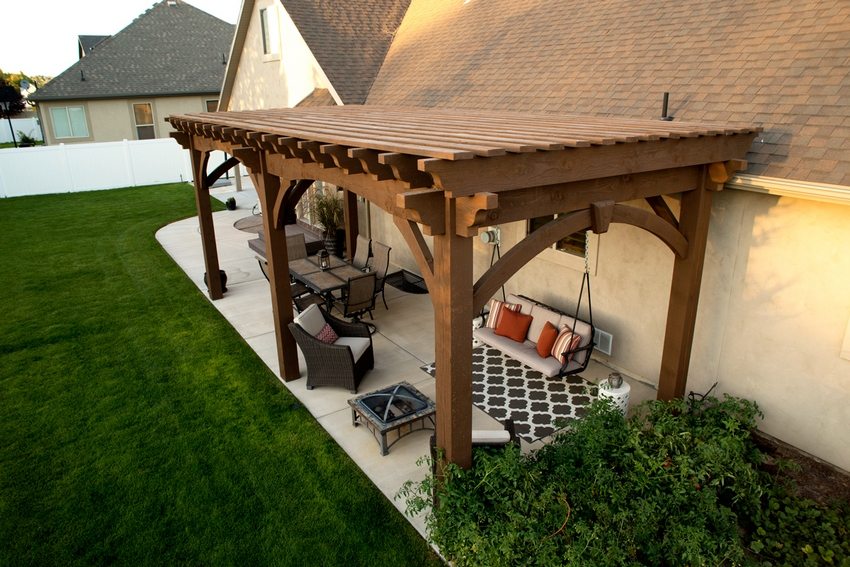 The awnings in the courtyard of a private house (photos confirm this) have a simple structure, consisting of supports, a frame and a roof covering. For supports, they usually use wooden logs or beams, steel pipes with round, square and rectangular sections, brick posts.