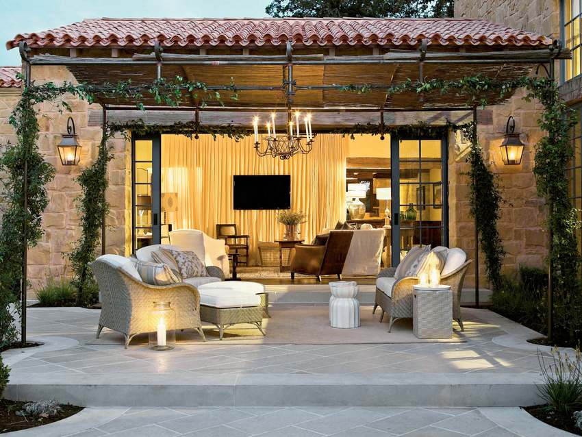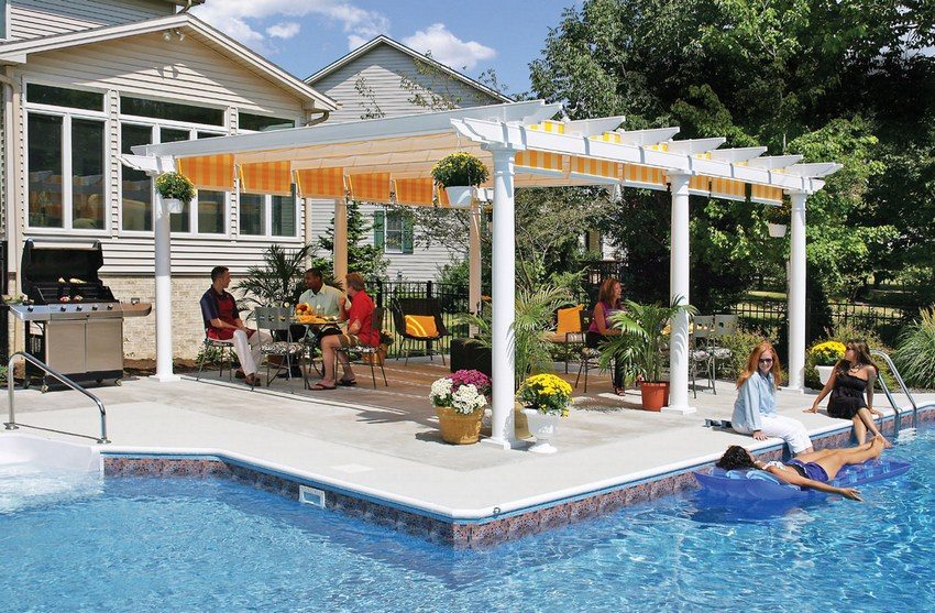 Protect from rain and sun, save the car from sudden hail, and the pool from crumbling foliage will help the awnings in the courtyard of a private house: photos of original light structures convince that awnings can be not only functional, but also have a completely attractive appearance. This is achieved through the use of modern high-quality materials in their construction. Each owner of his own cottage or country cottage seeks to equip the local area as comfortably as possible. And one of the main attributes in this arrangement is the canopy. Such a structure will allow you to do things planned in the yard, regardless of the whims of nature.