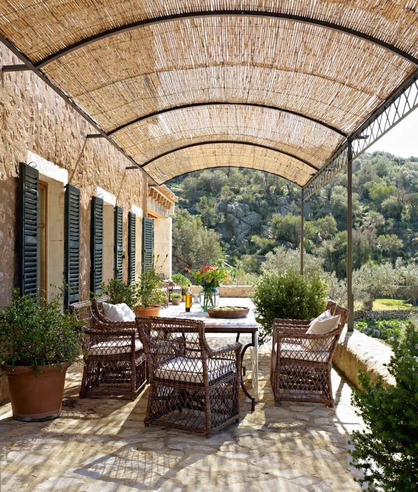 Having decided on the device of a canopy in the courtyard of the house, try to adhere to the correspondence of the dimensions and style of the structure to the main structure. Original awnings of various shapes should not stand out too much against the background of the facade, but only emphasize its design.
