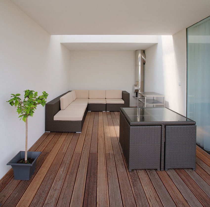 Installation of the flooring should be carried out at a slope of 2-2.5%. This is done in order to effectively drain rainwater. Often the terrace is adjacent to the building. In this case, the pendant should be directed away from the walls. There are logs under the flooring, and it is better to leave the gaps between them without filling. This solution will ensure high-quality ventilation of the structure.