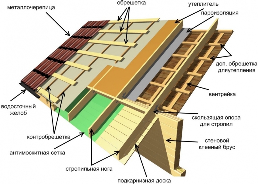 Roofing pie installation scheme: 1. Rafter system, 2. Counter battens, 3. Waterproofing film, 4. Vertical battens, 5. Horizontal battens, 6. Horizontal battens, 7. Additional battens, 8. Wind board, 9. Gutter bracket, 10. Cornice strip, 11. Metal tile, 12. Roof ridge. 13. Ridge seal, 14. Dormer window, 15. Thermal insulation material, 16. Vapor barrier material, 17. Attic lining.