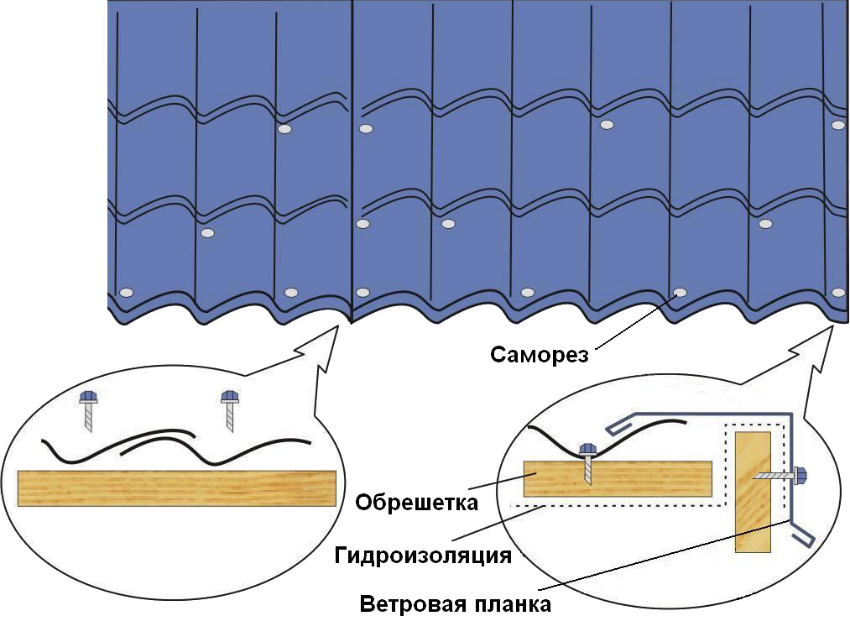 The fastening of the metal tile to the crate is carried out using self-tapping screws and a screwdriver